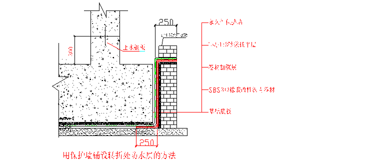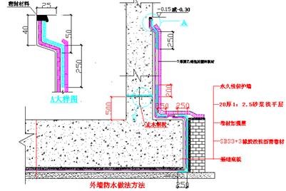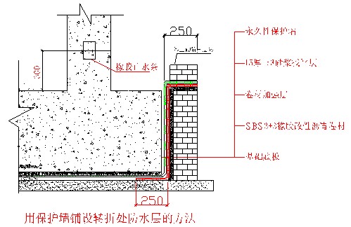 防水導(dǎo)墻上立面用2︰1(水泥︰中砂)加適量的水?dāng)嚢璩上≈酄睿嗌皾{內(nèi)摻水泥重量20%的881膠混合物,用磙子進(jìn)行拉毛,凝固手掰不動后,抹20mm厚1︰2.5水泥砂漿保護(hù)層。(如圖)