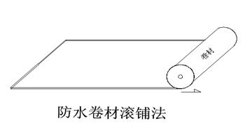 8)卷材防水層施工。本工程采用Ⅱ級,3mm+3mm SBS改性瀝青防水卷材,采用熱熔法進(jìn)行,施工卷材鋪貼方法和順序,根據(jù)現(xiàn)場實(shí)際情況東西方向?yàn)殚L邊鋪設(shè)方法;將成卷的3mm厚SBS橡膠改性瀝青卷材按彈好的標(biāo)準(zhǔn)位置線,將端頭置于鋪貼起始端,用噴燈離卷材50cm左右均勻烘烤卷材底面,當(dāng)?shù)讓尤刍接泄鉂砂l(fā)黑時即可;隨后用噴燈對準(zhǔn)卷材和基層表面夾角,噴燈距交界處約30cm左右,邊烘烤卷材和基層邊跟隨熔化范圍用雙手壓緊卷材緩慢的向前滾鋪,將其地面與基層粘貼牢固。(如圖所示)第一層施工完后進(jìn)行第二層卷材施工,方法同上。