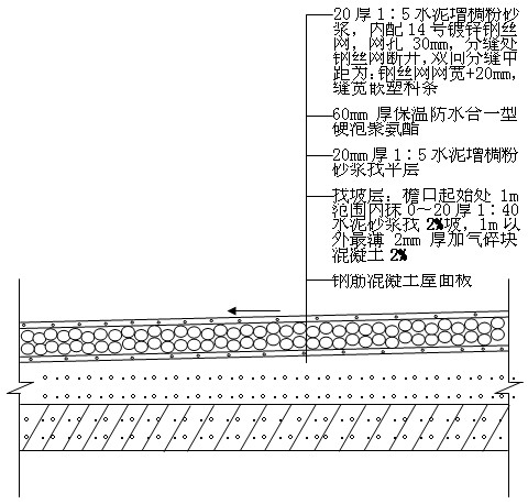 d.找坡層:檐口起始處1m范圍內(nèi)抹20mm厚1︰40水泥砂漿找2%坡,1m以外最薄20mm厚加氣碎塊混凝土找2%;