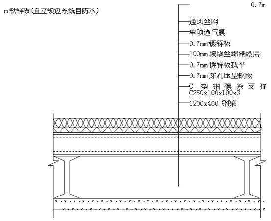 ?、陉惲叙^屋面做法材料(包括0.7mm 鈦鋅板直立鎖邊系統(tǒng)自防水;通風(fēng)絲網(wǎng);單項(xiàng)透氣膜;0.7mm鍍鋅板;100mm玻璃絲綿隔熱層;0.7mm鍍鋅板找平;0.7mm穿孔壓型鋼板;C型鋼檁條支撐 C250×100×100×3;1200×400鋼梁)必須符合質(zhì)量標(biāo)準(zhǔn)和設(shè)計要求;