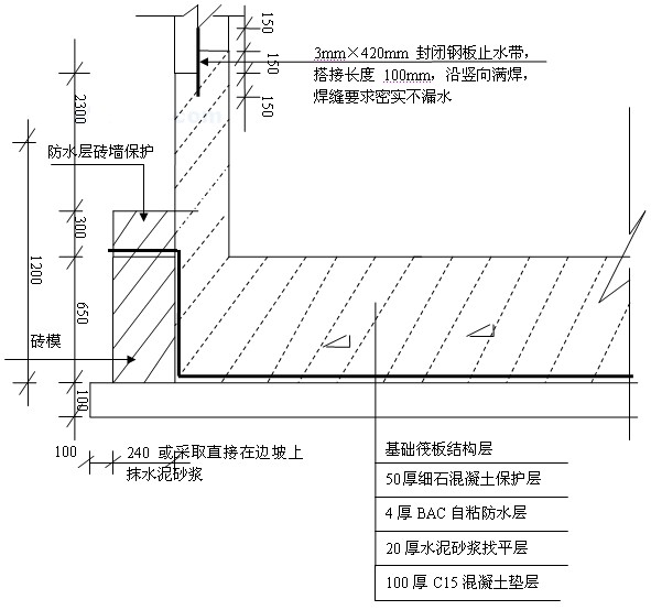 b.在水平施工縫處增設500mm寬水平卷材加強層。