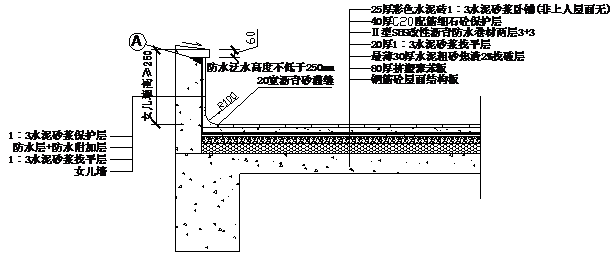②40mm厚C20細(xì)石混凝土保護(hù)層,配ф6單層雙向@150mm鋼筋網(wǎng)片。分格縫寬20mm,間距≤6m,分格縫內(nèi)嵌入建筑密封膏。