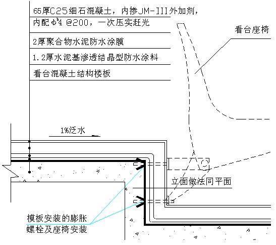 本層為看臺的面層,是看臺的使用層,亦是看臺防水的保護層,根據(jù)相關(guān)各方商定,將原設(shè)計做法進行改變,看臺直接做兩層防水后,再做65mm厚C25細石清水混凝土(內(nèi)配ф4冷拔鋼絲,雙向@200,摻JM-Ⅲ外加劑)即可。