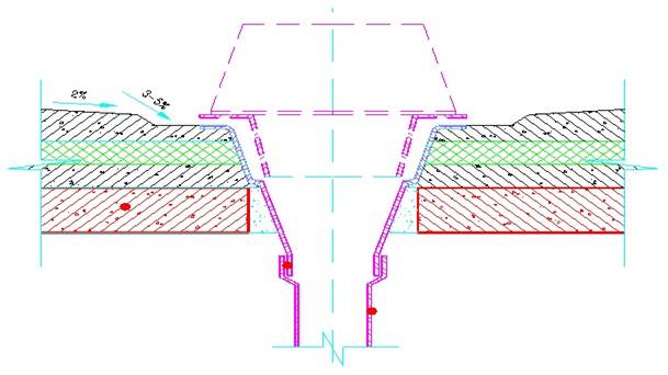 ?。?)陰陽角應(yīng)做成均勻一致、平整光滑的圓弧(R=100mm)或鈍角,內(nèi)部排水的落口周圍,找平層應(yīng)做成略低的凹坑,如圖2所示。