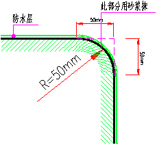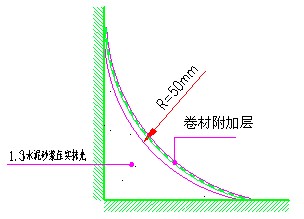 ?、捱吔翘幚?。溝邊、女兒墻拐角、管道等根部應(yīng)抹成圓角。