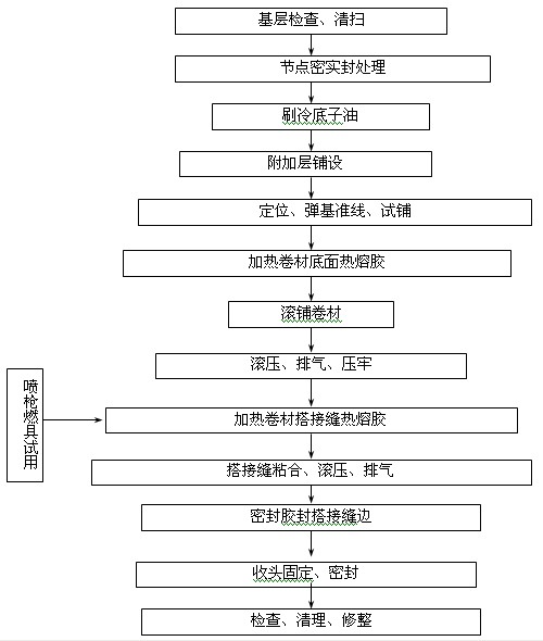 ?、贌崛鄯ㄍ男缘年P(guān)系。高聚物改性瀝青防水卷材各品種的改性基料成分有同,因之軟化點(diǎn)、熔融度及熔化速度亦不同。施工人員對所選卷材應(yīng)進(jìn)行探索試驗(yàn),調(diào)節(jié)火焰距離以及烘烤時間,觀察卷材底面熱熔膠的熔融狀態(tài)以及輔貼后卷材的粘貼強(qiáng)度累經(jīng)驗(yàn)后用于大面積施鋪。