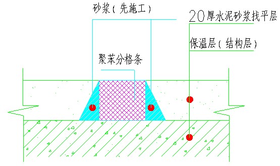 找平層分格采用切割機(jī)切縫。在找平層施工完約一周內(nèi),現(xiàn)按圖紙在找平層上彈線找出分割縫的位置,刀口深度調(diào)制35mm(注意不能大于40mm,避免切到排氣管道)。