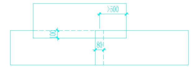 ?。?)卷材搭接。搭接寬度長邊不小于80mm,短邊不小于100m;相鄰卷材的短邊搭接縫要錯開500mm以上,不允許在同一直線上,如圖22所示。