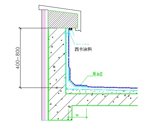 ?、谙日迟N平面與立面的陰角部位附加層或積水坑陰陽角附加層卷材。附加層卷材寬為300~500mm。附加層鋪貼高分子防水卷材(圖20、21)。