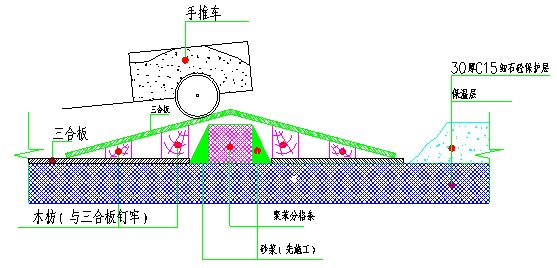 ?。?)在澆筑細(xì)石混凝土保護(hù)層時,運(yùn)送混凝土小車的鐵腿必須用橡膠卷材墊好,并要捆綁牢,避免小車鐵腿損壞防水層。如發(fā)現(xiàn)防水層損壞,立即修補(bǔ)。