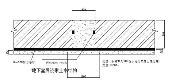 8)地下室底板、頂板后澆帶防水層做附加增強(qiáng)處理,采用滿粘法加鋪1道,兩邊各余出300mm,與兩邊卷材相搭接。