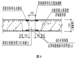 取芯部位鋼筋已截斷,因此先用短鋼筋與樓板鋼筋通過焊接連接進行鋼筋補強,后對邊緣部位混凝土面剔鑿,原鋼筋保留,重新澆注C40膨脹混凝土,見圖8.
