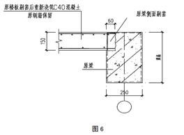 將原框架梁頂面局部混凝土剔鑿,新澆注樓板鋼筋錨入框架梁內(見圖6)樓板鋼筋的錨固,又解決了新澆注樓板與原框架梁交接處的剪切。