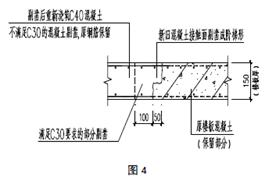 將客廳頂板剔鑿后的缺陷部位采用C40膨脹混凝土重新澆筑??蛷d板上線管偏位、修補部位結合加固同時處理。為了保證新舊混凝土的連接部位的可靠性,保證力的可靠傳遞,在新舊混凝土交接處清除松散混凝土,并涂刷界面劑,接處將原混凝土面提造成階梯狀(見圖4)。