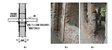 在拆除墻體裝飾層時(shí),由于施工不當(dāng),造成墻體破壞嚴(yán)重,尤其窗間墻小墻肢,如圖4、圖5。發(fā)現(xiàn)此問題后,設(shè)計(jì)要求對破壞嚴(yán)重墻體采取支模后灌灌漿料進(jìn)行加固。