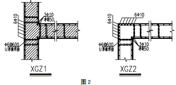 3)外墻四角,大房間內(nèi)、外墻交接處,樓梯間等必須設(shè)置構(gòu)造柱處,增設(shè)構(gòu)造柱。采用鋼絲網(wǎng)水泥砂漿加固時(shí),根據(jù)《建筑抗震加固技術(shù)規(guī)程》條文說明,可以利用面層中的配筋加強(qiáng)帶起構(gòu)造柱圈梁的約束作用,在外墻四角,大房間內(nèi)、外墻交接處,樓梯間四角及梯段兩端部位加強(qiáng)鋼筋,并配置U形箍筋可靠拉結(jié)墻體兩側(cè)的加強(qiáng)筋,如圖2.