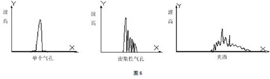 (1)點狀缺陷(氣孔)主要特征是超聲波檢測時,在不同方向探測,缺陷回波無明顯變化,氣孔的回波高度低,波形較穩(wěn)定,從各個方向探測反射波高大致相同,但稍移動探頭就消失。而金屬夾渣或非金屬夾渣的反射波要低一些,波形寬,呈齒形;密集性氣孔為一簇反射波,其波高隨氣孔的大小而不同,當(dāng)探頭作定點轉(zhuǎn)動時,會出現(xiàn)此起彼落的現(xiàn)象。(靜態(tài)波形參照示意圖如圖6)