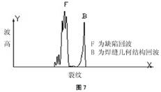 (2)裂紋 主要特征是超聲波檢測時裂紋回波較高,波幅寬,會出現(xiàn)多個波峰。探頭平移時,反射波連續(xù),波幅有變動;探頭轉(zhuǎn)動時,波峰有上下錯動現(xiàn)象。另外,裂紋也易出現(xiàn)在焊縫熱影響區(qū),而且裂紋多垂直于焊縫,探測時應(yīng)在平行于焊縫方向掃查。此時如有缺陷,超聲波能直射至裂紋,便于發(fā)現(xiàn)。(靜態(tài)波形參照示意圖如圖7)
