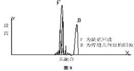 (4)未熔合 其形成原因是在熔接時,焊道與母材之間或焊道與焊道之間未完全熔化結(jié)合的焊縫位置。主要特征是當(dāng)超聲波檢測時,超聲波垂直入射到其表面時,回波高度大。探頭移動時,波形較穩(wěn)定;兩側(cè)探測時,反射波幅不同,有時只能從一側(cè)探測到。(靜態(tài)波形參照示意圖如圖9)