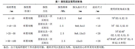 GB/T11345-1989及JG/T203-2007標(biāo)準(zhǔn)的探頭要求。因現(xiàn)場焊接件桿件的厚度有6~80mm不等厚,根據(jù)以下表格在實際檢測中選中探頭.