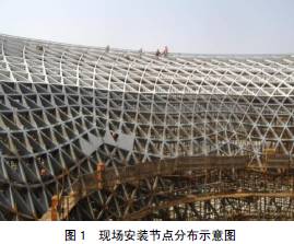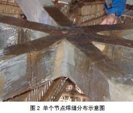 某鋼結(jié)構(gòu)工程采用的是鋼結(jié)構(gòu)網(wǎng)殼形式設(shè)計,該結(jié)構(gòu)具有堅實耐用、可塑性強、造型新穎別致的特點。此工程大約由1680個形狀各異的中央連接節(jié)點和6120根箱型桿件現(xiàn)場焊接而成,由于都是現(xiàn)場吊裝焊接,所以其焊接條件環(huán)境以及構(gòu)件本身的幾何條件對焊接質(zhì)量提出了很高的要求,保證焊縫質(zhì)量顯得尤為重要,具體結(jié)構(gòu)如圖1、圖2所示: