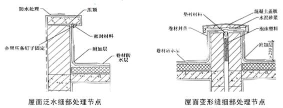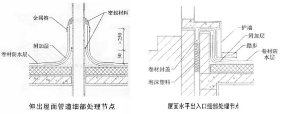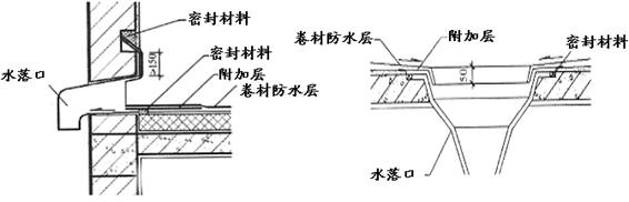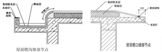 ?、谔鞙?、檐溝應設置防水涂料附加層。鋪貼卷材須從溝底開始,當溝底過寬、卷材需縱向搭接時,搭接縫、卷材收頭等處均需密封材料封口。