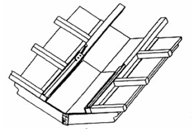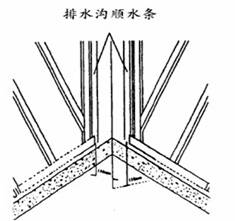 ①順水條尺寸:25mm×40mm,用長于50mm的水泥鋼釘(直徑4mmHRA74~78)按墨線位置將順水條固定在屋面上,釘子的最大間距為450mm,順水條應與檐口平齊,頂端切成斜角,使其與屋脊平齊(距屋脊30mm)未端離屋檐邊20mm。排水溝兩邊按彈線位置(距中心150mm)各釘一根順水條,在屋端與屋檐處其兩端應與其它順水條截齊(圖8),斜屋脊兩邊也各釘一根順水條(圖9)。
