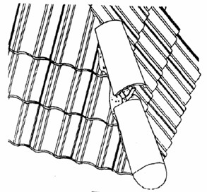 鋪設時用電動鋸來切割瓦片。鋪設整齊后,應用水泥砂漿將瓦片底部空隙處全部封?。▓D14)。切下的小瓦片在上邊鉆小孔,將其釘在掛瓦條上。