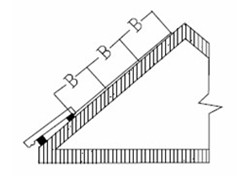?、劬辔蓍芫€350mm彈一平行于屋檐的平行線。此處是釘第一根掛瓦條,上棱對齊位置,以使第一揸瓦挑檐50mm。為保證瓦條間距均勻相等,按A的長度進行均分計算(圖6)。B是瓦條間距(圖7)自第一根瓦條向上每隔B彈一根線,直至屋脊沿線。