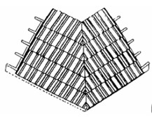 ①平瓦鋪設。在屋檐右下角開始第一張瓦片的鋪設,自右向左,自下而上??圻B瓦片時,瓦爪必須緊扣掛瓦條,瓦右緣應距檐口50~60mm(圖17),為使左緣檐口也為50~60mm,瓦與瓦之間的扣連搭接有3mm可調整。對于窄屋面處可將瓦片切割(圖16),距檐口的距離應根據不同的檐口處理來決定(圖15),這是是指雙坡(人字形)屋面。上下瓦的結合部可成一直線(也可交錯排列)。如用開放式結構,須從兩個坡面同時上瓦,嚴禁單坡上瓦。斜脊處的平瓦,應使兩邊的瓦盡可能地吻合于中心線(圖15)。
