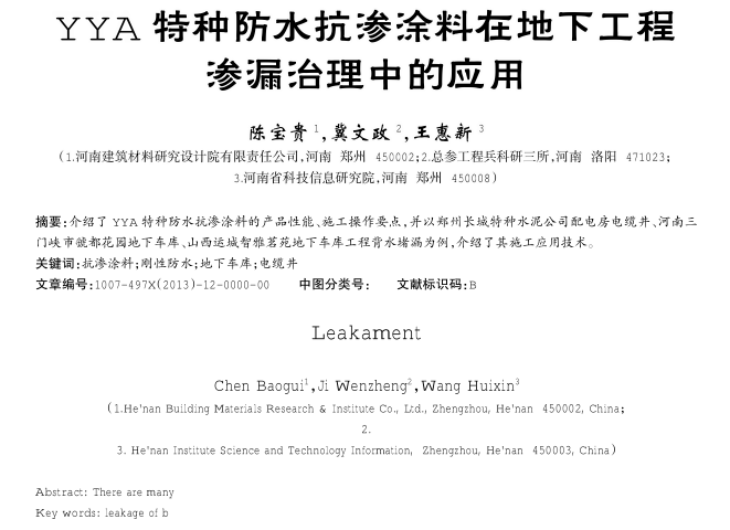 2013年6月,由國內(nèi)防水專家聯(lián)名撰寫的鄭州賽諾建材生產(chǎn)的YYA特種防水抗?jié)B漿料在地下工程中的應(yīng)用的文章在中國建筑防水雜志上發(fā)表。該文章闡述的地下工程的各種混凝土缺陷,混凝土裂紋,外防水的失敗等各種問題發(fā)生后,如何在里面重新建立一道防水系統(tǒng),以及鄭州賽諾的背水一噴靈的原理,施工步驟等。