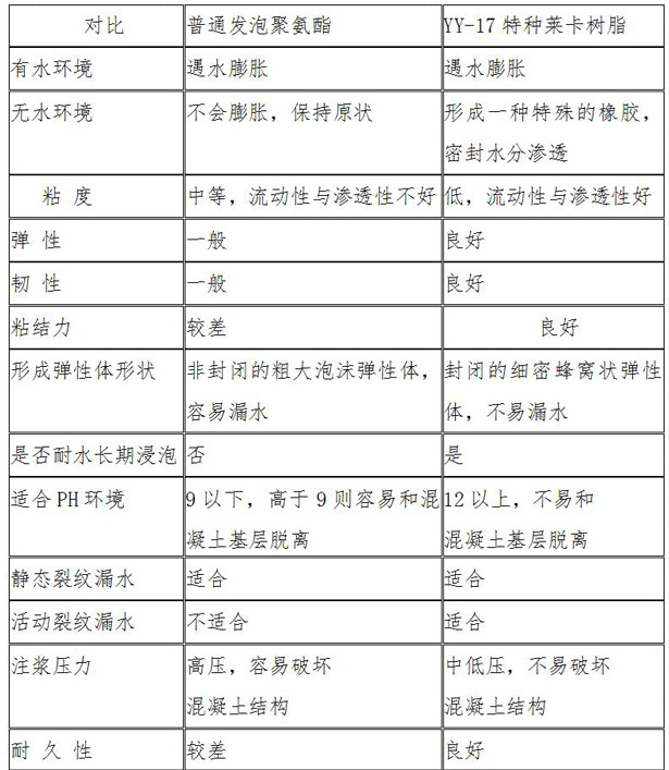 公司開發(fā)的漏水一注靈-YY-17特種萊卡樹脂,與水膨脹,止水;無水時,形成橡膠,長期耐水浸泡,不溶脹,可以與潮濕混凝土長期粘結(jié)在一起,從而適合活動裂紋漏水的治理,這是與市場上的聚氨酯材料的區(qū)別。